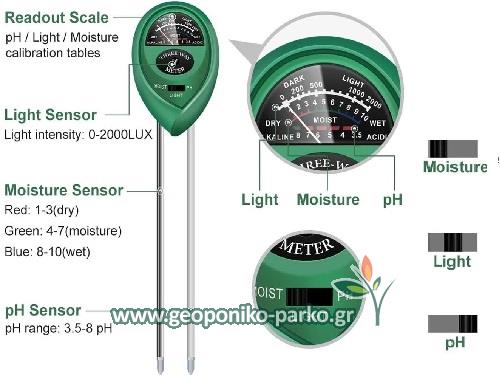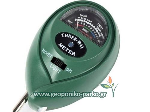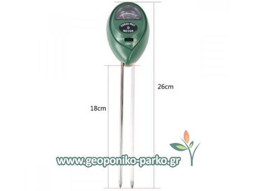 Εύχρηστο όργανο τριπλής ενέργειας, δηλαδή μέτρησης υγρασίας εδάφους, οξύτητας ( ph) καθώς και φωτεινότητας, ταυτόχρονα. Τοποθετείται εύκολα στον κήπο ή στις γλάστρες σας, καρφώνοντάς το στο χώμα και γυρίζοντας το διακόπτη στην ένδειξη που επιθυμείτε να μετρήσετε.Διαθέτει ευανάγνωστη οθόνη και καρφιά μήκους 18 cm για σταθερή τοποθέτηση.Δεν απαιτούνται μπαταρίες για τη λειτουργία του.